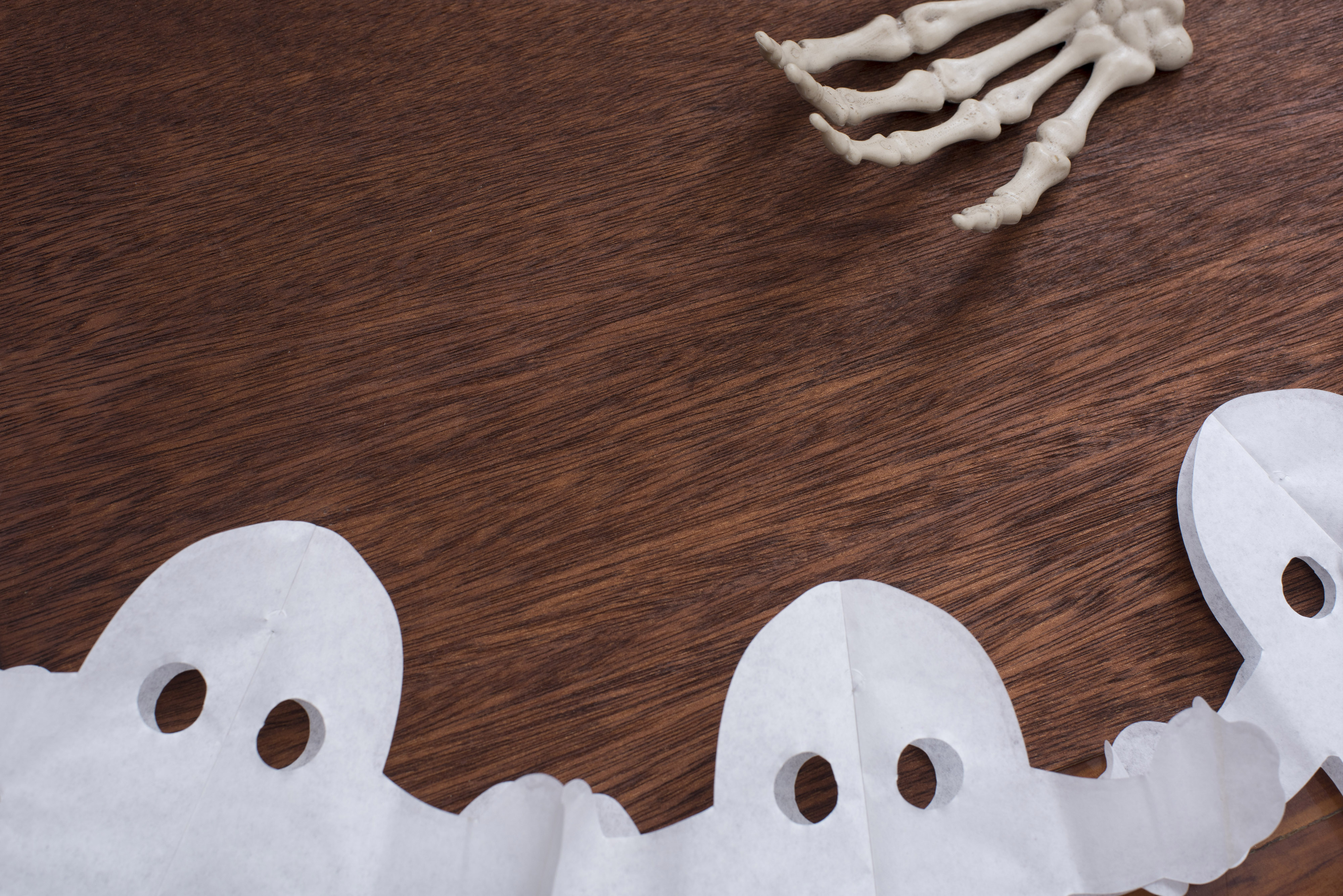 a background image of halloween decorations on a wood surface featuring a skeleton hand and some paper ghosts