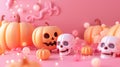 Top down view on nine plastic skulls lit from within over wooden background for concept about halloween or death