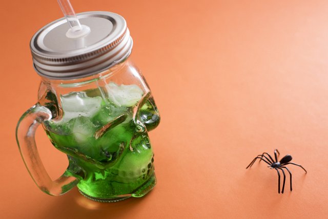 Skull shaped glass mug filled with green colored beverage and ice cubes facing little plastic spider over orange background