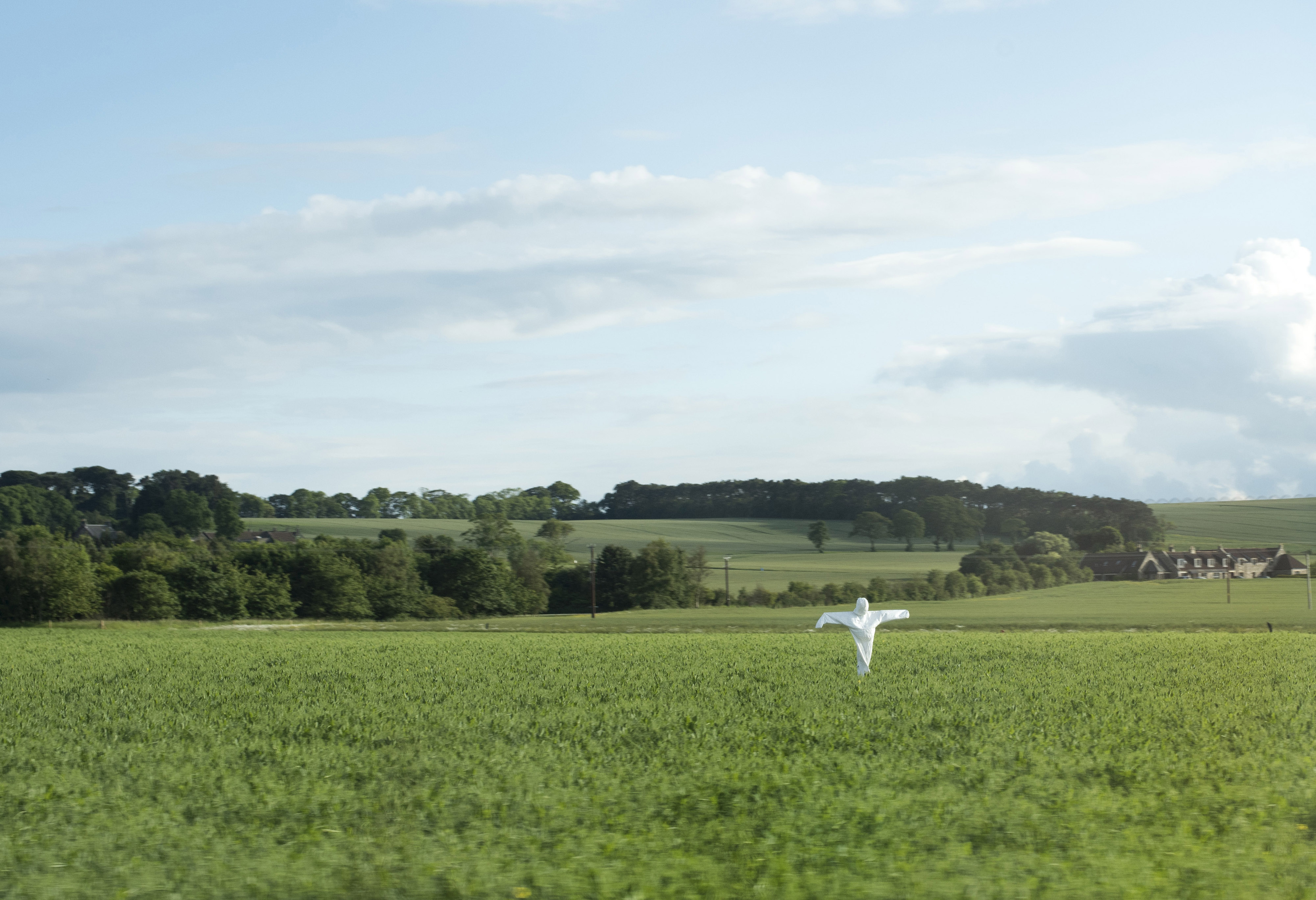 Spooky white scarecrow in an agricultural field scaring the birds from the crops in a lush green hilly landscape under a cloudy blue sky